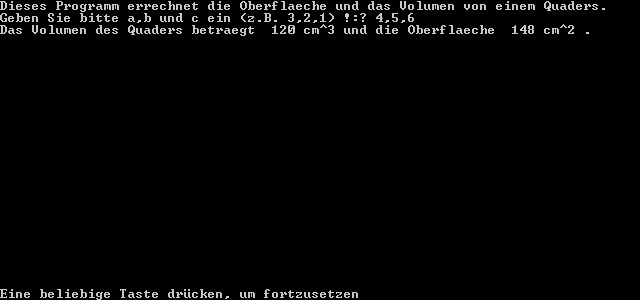 PRINT "Das Volumen des Quaders betraegt "; V; "cm^3 und die Oberflaeche "; O; "cm^2 ."